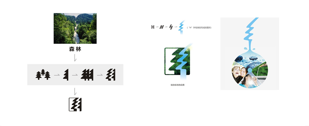 “活力森”品牌中的“活”代表了水的流動與鮮活,“森”代表了來自森林中的水,我們選取這兩個具有代表性的文字進行變形設計。“活”的拼音首字母“H”變形,衍化成一條傾瀉而下瀑布,富有流動感的線條生動地展現出活力森的“活水”之勢。