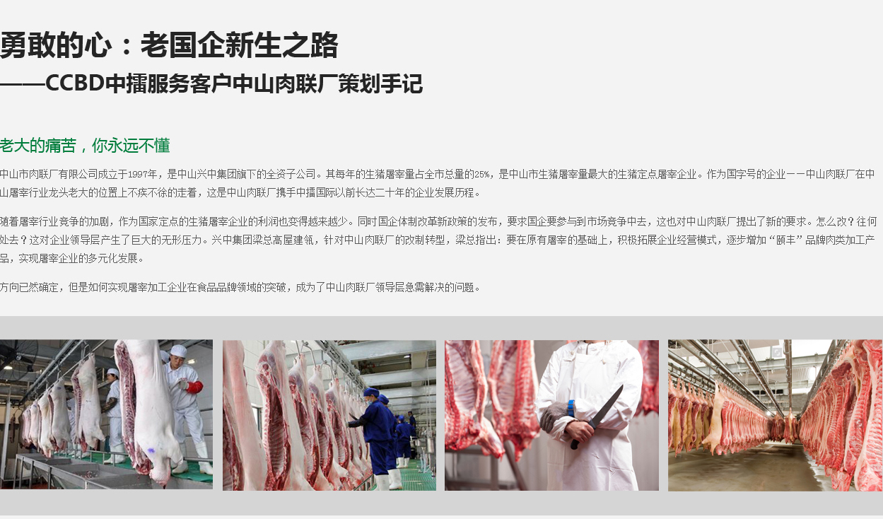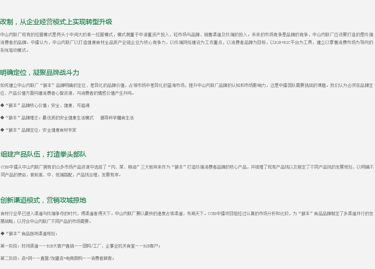 中山肉聯(lián)廠最終將成為一個(gè)傳奇,因?yàn)樵谡蟛环值摹皣弊痔柶髽I(yè)里,能夠大膽革新,進(jìn)行全新的品牌嘗試是不多見的。與CCBD中擂的合作,給這個(gè)處于困境中的企業(yè)帶來了全新的發(fā)展思路和轉(zhuǎn)型之機(jī)。我們相信,萬事開頭難,只要改革創(chuàng)新定能給企業(yè)帶來全新的發(fā)展,開拓更廣闊的市場空間。