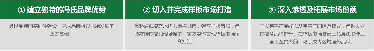 根據(jù)雙方溝通,中擂對馮氏莊園做出了三年戰(zhàn)略規(guī)劃,用三年時間來打造一個成長性品牌,即同時兼顧發(fā)展速度與競爭力,打造一個區(qū)域強(qiáng)勢品牌。圍繞規(guī)劃,雙方制定了馮氏莊園的品牌目標(biāo):