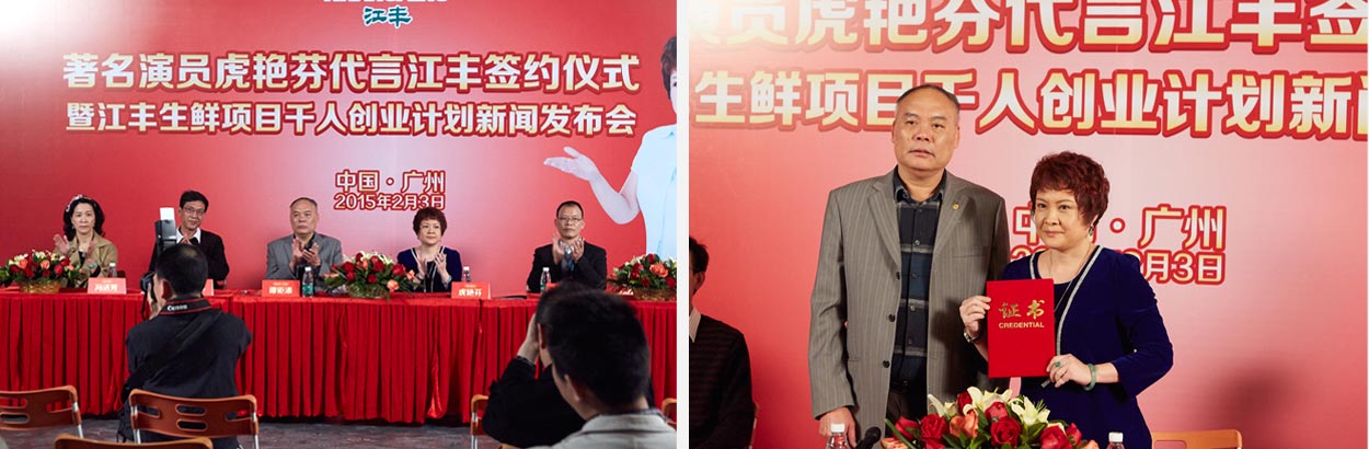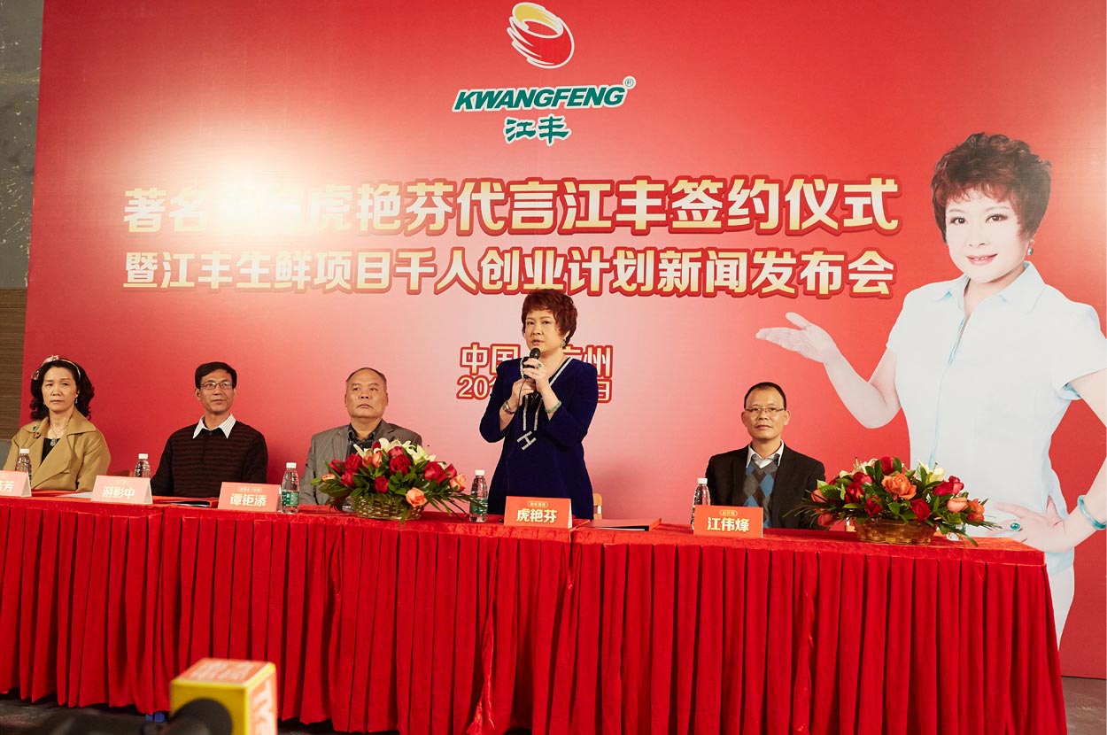 通過明星進行品牌代言,企業(yè)能借助明星的知名度來迅速提高品牌知名度;還能提升產品在消費者心目中的品牌形象;加之能顯示企業(yè)實力,鼓舞員工及經銷商的士氣,并增強企業(yè)凝聚力及經銷商的代理信心。在CCBD中擂的協(xié)助下,江豐公司正式簽約著名演員虎艷芬女士作為江豐品牌形象代言人,憑借虎艷芬女士在廣東本土的高知名度和人氣,必將帶來江豐品牌知名度的大幅提升。