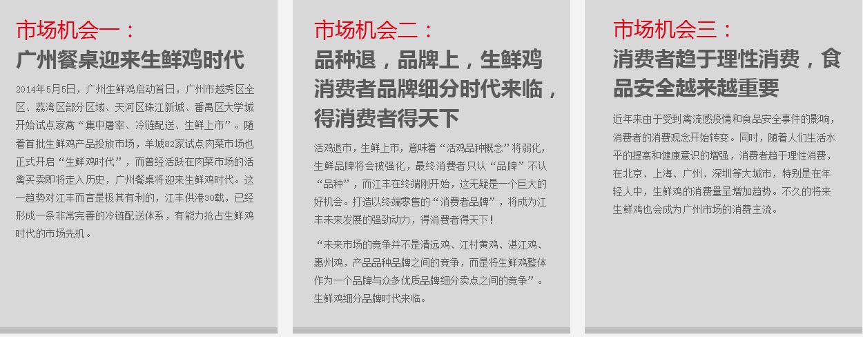 最后,從企業(yè)角度來說,江豐過去是以外銷為主導,主要市場在香港,卻忽略了家門口的生意,所以在內地肉雞終端市場的知名度很低,市場影響力小。此次廣州肉雞市場的改革,對江豐企業(yè)的轉型無疑是一次重大的市場機遇。本次策劃,CCBD中擂將以廣州市場為基點,開啟江豐的品牌轉型之路,進而輻射珠三角,直至覆蓋全國市場。