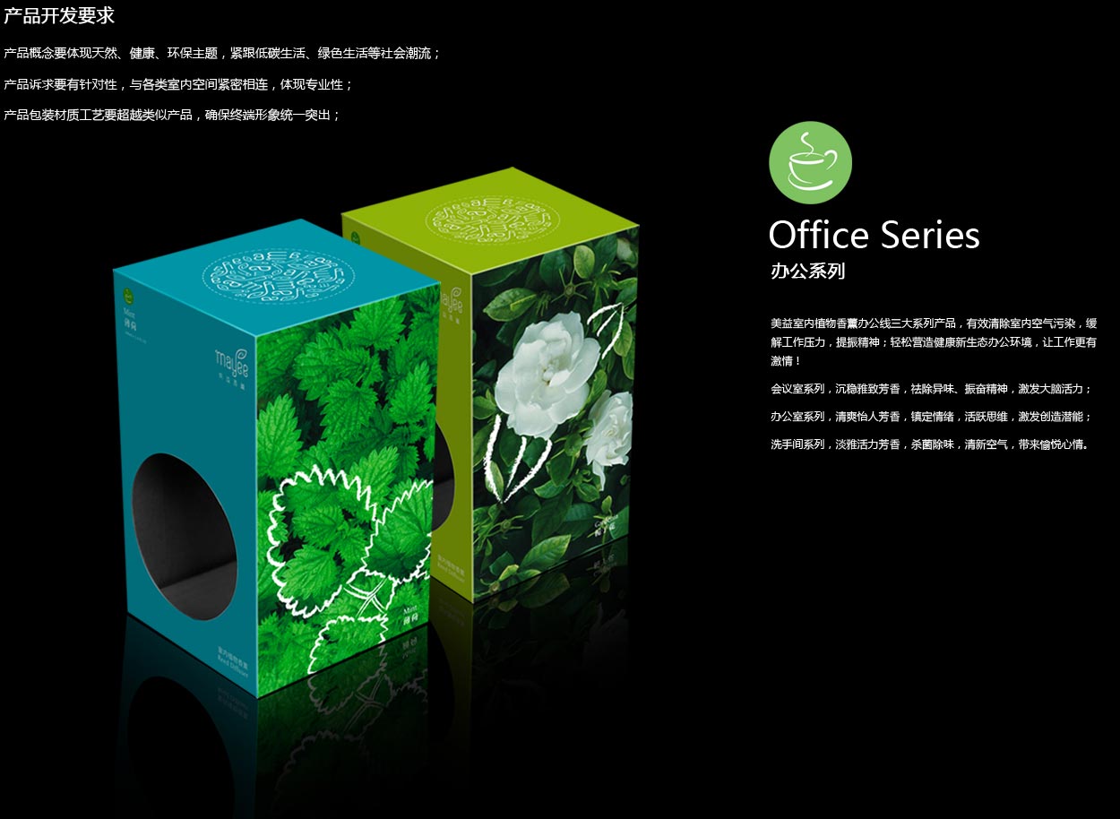 針對這個問題,中擂服務(wù)小組目標非常清晰,就是要在產(chǎn)品上做文章,在中擂黃總的帶領(lǐng)下,我們對美益70多個香薰產(chǎn)品進行分析,從產(chǎn)品的提煉流程,到產(chǎn)品的應用及最終消費者的行為劃分,最終將產(chǎn)品分為:家居、辦公、酒店、禮品四大系列,并對不同的系列制定了不同的表現(xiàn)屬性,制定了“1+4+N”的個性化包裝表現(xiàn)策略。