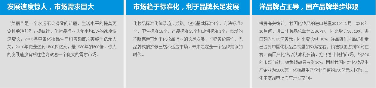 相關(guān)資料顯示,我國在逐漸發(fā)展成為化妝品消費大國,總體消費水平已超越歐盟、日本,僅次于美國,成為世界上化妝品第二消費大國,而且我國人口眾多,人均消費水平較低,還存在相當大的市場消費潛力,這無疑會給化妝品企業(yè)帶來很多發(fā)展機會。但是,擁有世界級市場的同時,我國也已經(jīng)有了世界級的競爭,跨國公司紛紛進駐中國化妝品市場,將中國視為長期發(fā)展的最重要市場,以各種方式搶灘登陸。