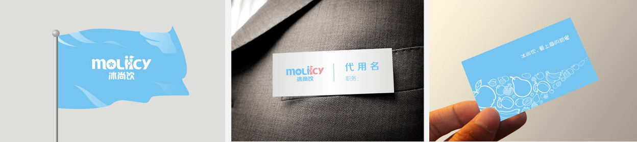 Logo標(biāo)識是傳播產(chǎn)品理念和精神的載體。冰尚飲的logo設(shè)計源自moliicy,取自漢語“魔力”的拼音和冰的英文icy的結(jié)合,寓意魔力與冰的結(jié)合,logo主色調(diào)采用粉藍色與粉紅色,迎合冰尚飲年輕時尚的消費群體的色彩喜好,logo整體結(jié)構(gòu)設(shè)計一目了然。在不影響其整體視覺識別的情況下,在“魔”字的尾音字母O上賦予其雪花的形體,象征著冰爽、清涼、浪漫之意;在moliicy一詞中間兩個i的字母,利用其字形優(yōu)勢設(shè)計成一男一女,這兩個i一個代表魔力,一個代表冰,中間的愛心結(jié)合象征魔力與冰的結(jié)合相融。易記易懂,且色調(diào)和形體都不失時尚大方之體,將品牌的“冰”、“尚”、“飲”完美演繹。
