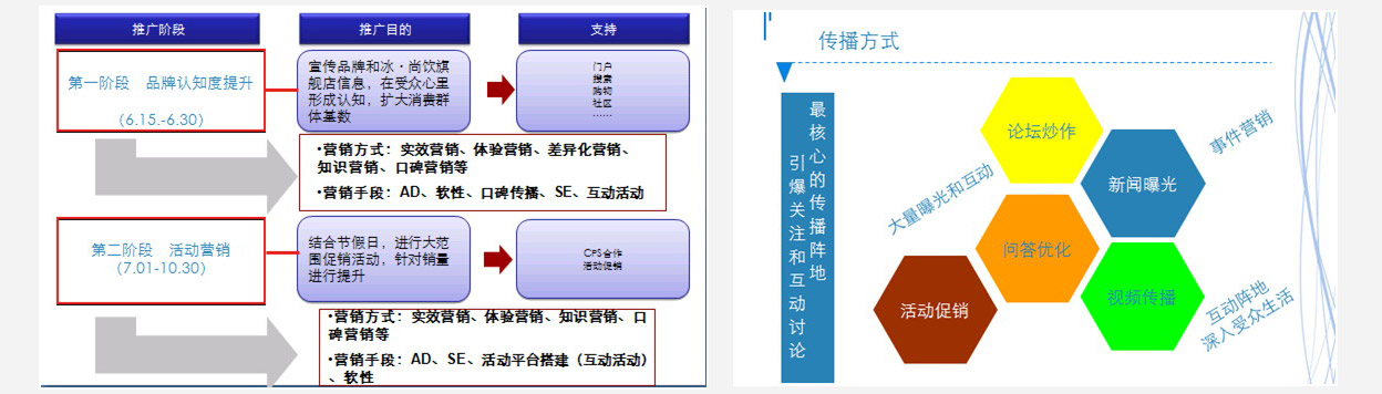 中擂觀點認(rèn)為冰·尚飲作為一個專注于年輕時尚、兒童的網(wǎng)購品牌,以魔力冰沙杯產(chǎn)品為主打,依靠網(wǎng)購平臺進行銷售。中擂認(rèn)為在推廣傳播上應(yīng)以網(wǎng)絡(luò)推廣為主,針對全民網(wǎng)友,特別是時尚白領(lǐng)、潮流一族、學(xué)生群體宣揚冰尚飲的品牌形象,美加好作為全新的品牌在中國發(fā)展需要提高其知名度和影響力,為此中擂針對冰尚飲的線上線下的渠道規(guī)劃提出了傳播的總體思路規(guī)劃,先是積累人氣,達到一定的轉(zhuǎn)化率從而促進產(chǎn)品的營銷,其次通過良好的服務(wù)達到口碑營銷的效果,這樣可以提升顧客的回頭率,2013年對于冰尚飲的品牌建立成長是非常關(guān)鍵的一年,需要解決提升知名度、樹立企業(yè)形象、促進銷售的任務(wù)。中擂作出了從不同角度達到不同品牌效應(yīng)的傳播推廣,全方位的網(wǎng)絡(luò)營銷可以擴大品牌在消費者中的知曉面,多角度的論壇營銷可以提升品牌在互聯(lián)網(wǎng)上的瀏覽量,意見性的博客營銷可以刺激提升品牌的關(guān)注度,助推式口碑營銷可以提高品牌度。