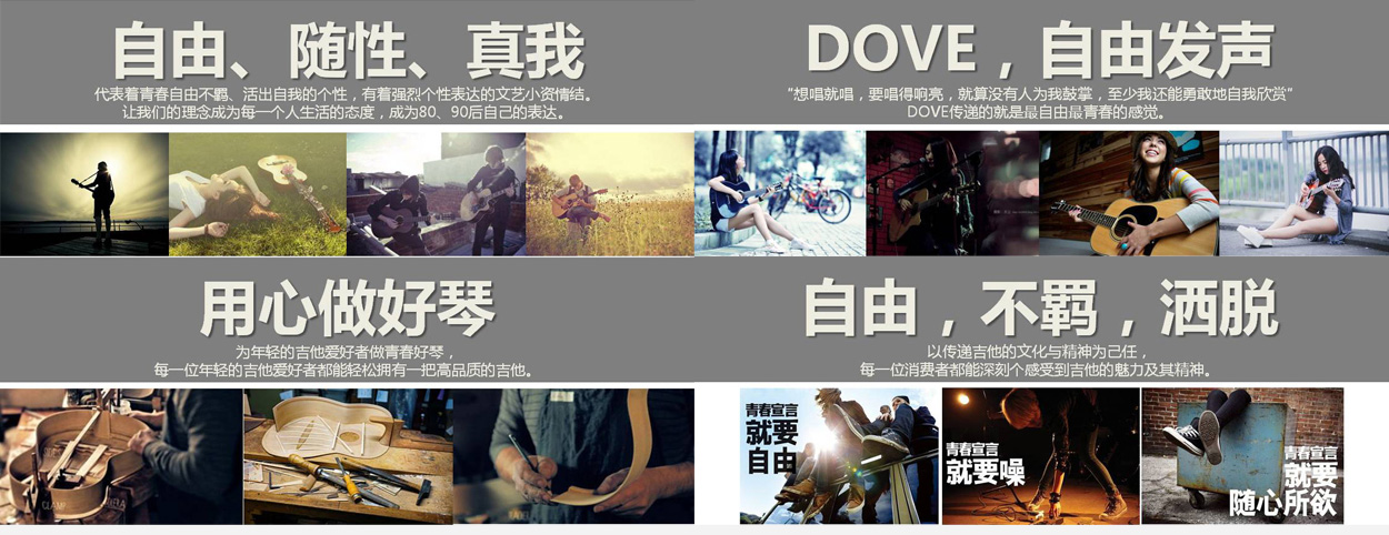 如果品牌是一個(gè)人,那DOVE就是一個(gè)充滿朝氣有理想的藝術(shù)青年,他熱愛藝術(shù),熱愛吉他,用吉他來演繹自己的才華。他有著一顆追求自由的心,積極追求自己的夢想;為有音樂夢想的人用心做好琴,打造打造吉他民族品牌領(lǐng)導(dǎo)者他獨(dú)立自主,敢想敢做,遵從內(nèi)心,活出真我。