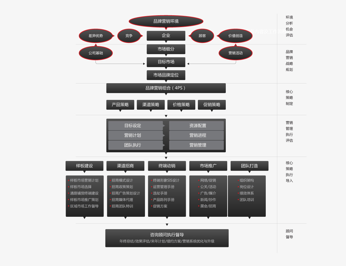 | 市場 | 戰(zhàn)略 | 目標(biāo) | 計劃 | 模式 | 品牌 | 產(chǎn)品 | 價格 | 渠道 | 終端 | 招商 | 推廣 | 團(tuán)隊 | 管控 | |