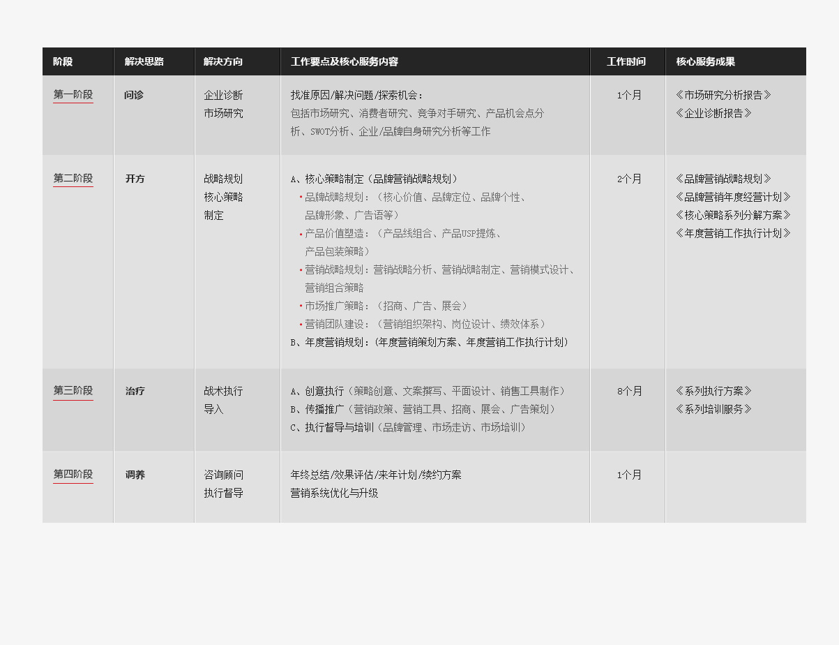 | 目標(biāo)市場選擇 | 策略說明 | / | 人才計劃 | 推廣模式 | 品牌形象 | 產(chǎn)品包裝 | 價格模型 | 渠道管理 | 終端促銷 | 招商推廣 | 媒介投放 | 團(tuán)隊培訓(xùn) | 售后服務(wù) | |